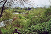 landschap van poelen en wilgen en hoog opgeschoten bloeiende planten. Hiertussen door leidt een pad