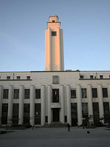 streng gebouw dat het gemeentehuis bleek te zijn, een ontwerp van Robert Giroud.