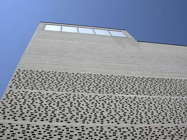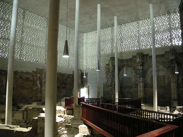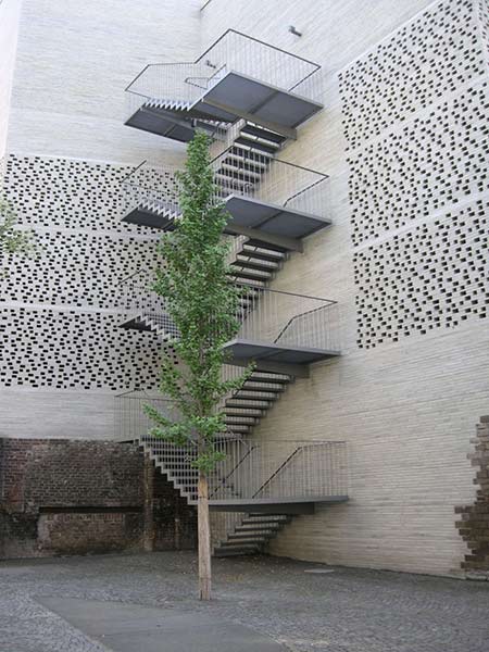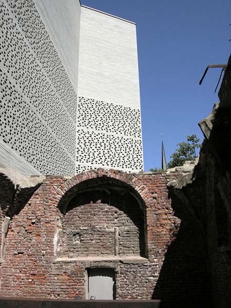 eenvoudig ogend maar complex gebouw op de fundamenten van de laatgotische kerk van St Kolumba, en